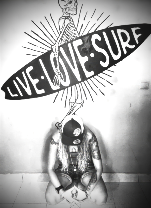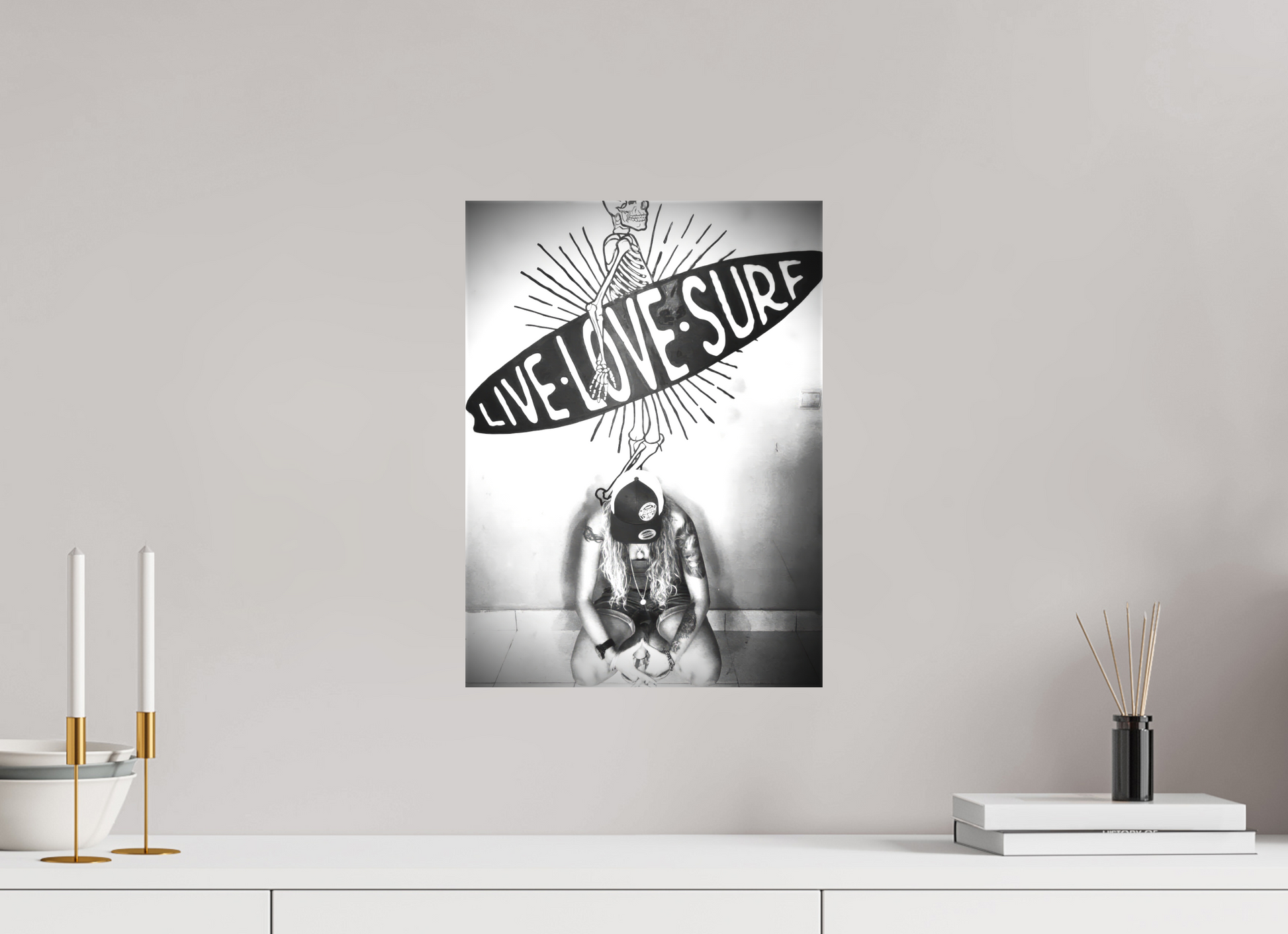 Cette oeuvre en noir et blanc juxtapose la vie et la mort à travers l'image d'in surfeur squelettique, symbole d'une passion éternelle pour les vagues. La silhouette du personnage, assis en méditation, évoque une introspection profonde, tandis que le message "LIVE LOVE SURF" résonne comme un mantra de liberté. Les détails des tatouages et du chapeau ajoutent une touche d'authenticité à cette scène urbaine, fusionnant culture surf et art mural. En arrière-plan-plan, l'illustration dynamique du squelette rappelle que même dans la mortalité, l'esprit de l'aventure demeure vivant.