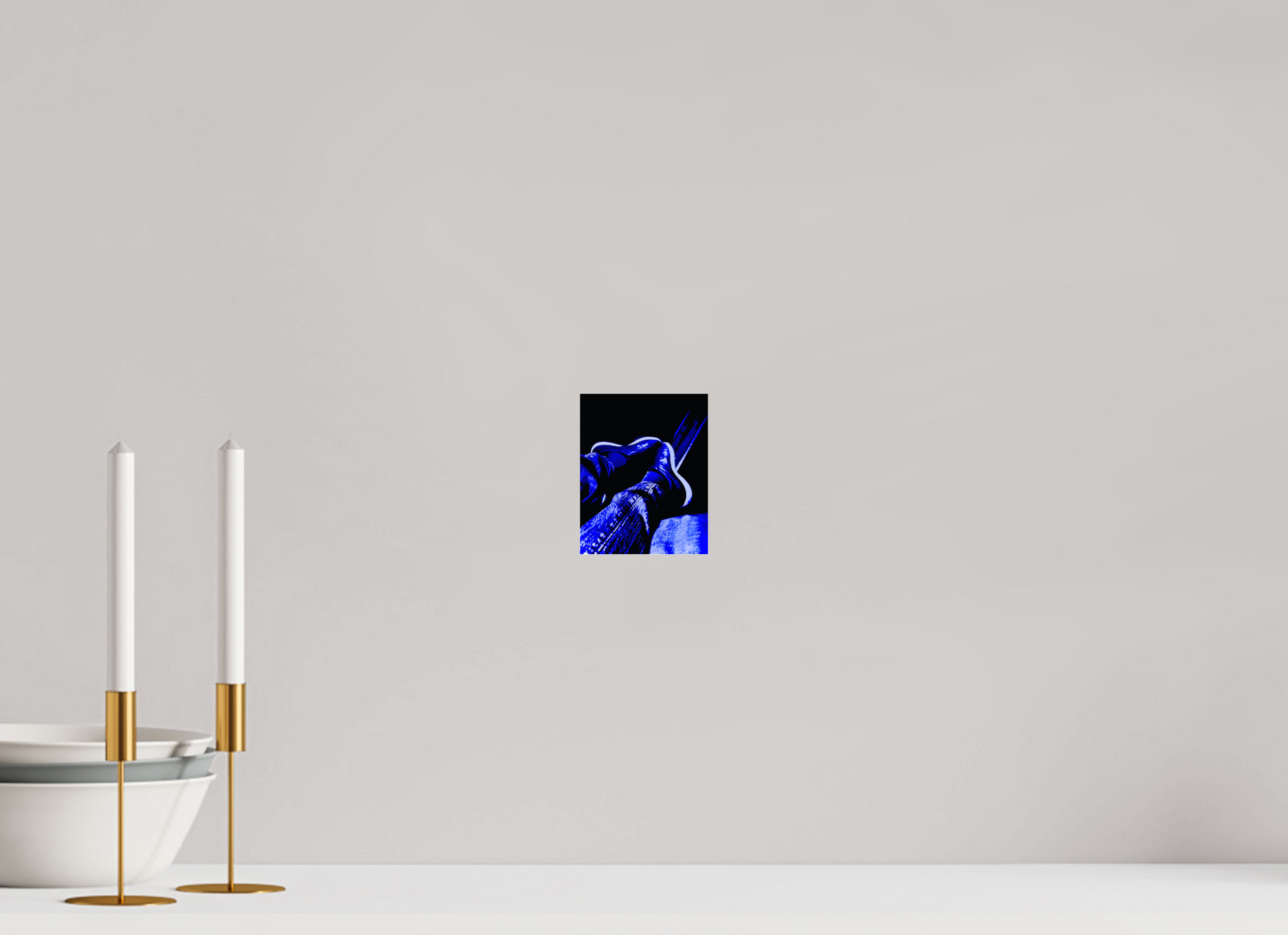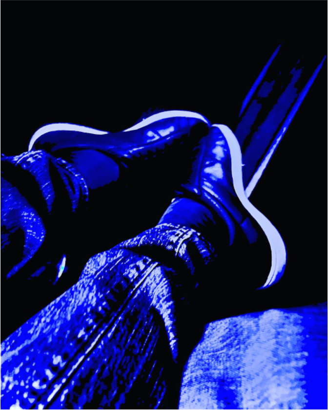 Cette oeuvre capture une vue dynamique de chaussures élégantes reposant sur un fond sombre, teinté de nuances de bleu. Les reflets brillants et les textures des jeans ajoutent une dimension tactile, tandis que le contraste entre les lumières et les ombres évoque une ambiance urbaine et contemporaine. L'image invite à une réflexion sur le mouvement et l'identité, soulignant le style personnel dans un monde moderne et vibrant.