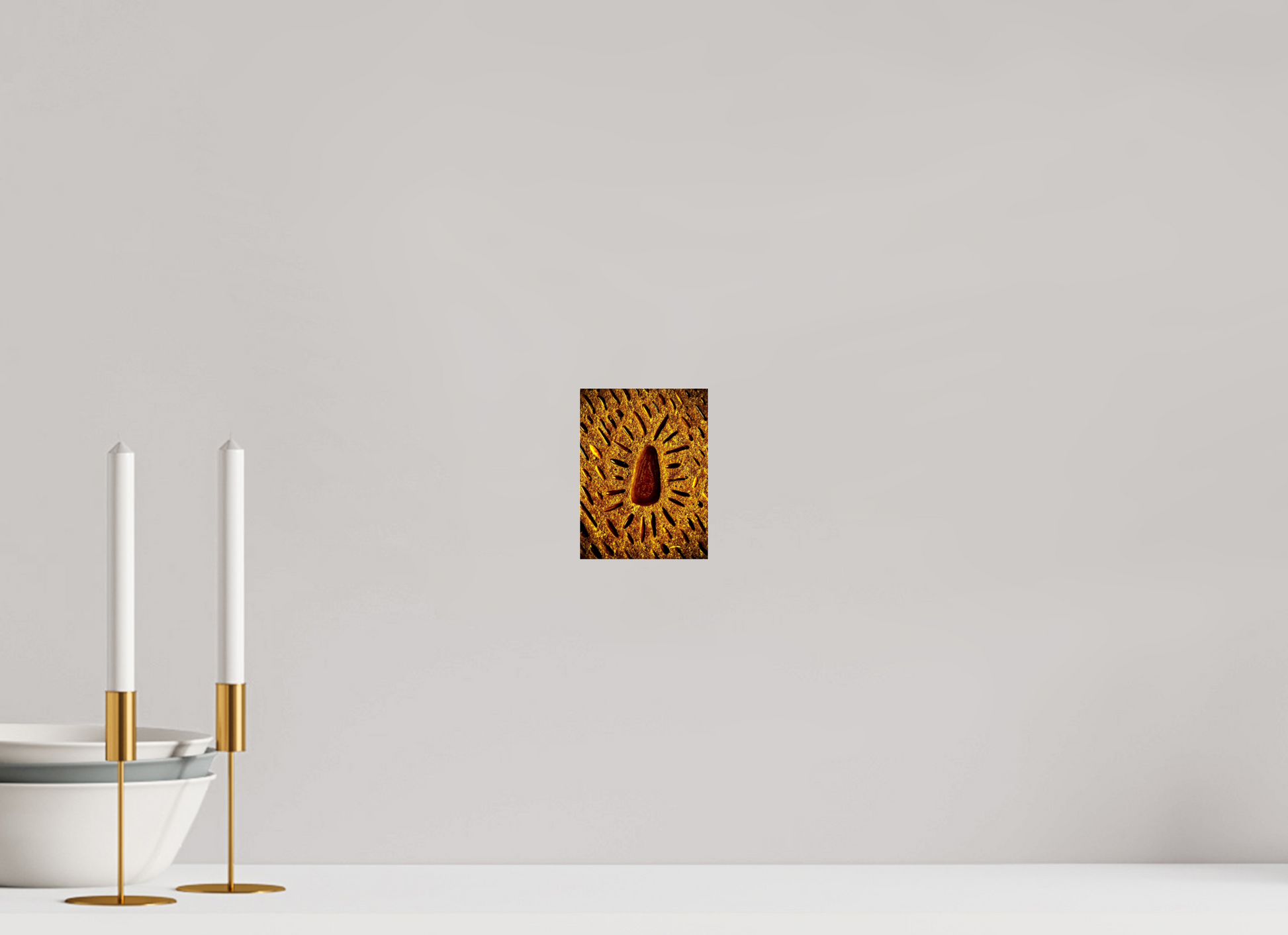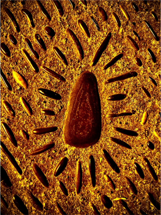 Cette oeuvre capte une énergie vibrante où la matière semble irradier une chaleur intense. Le jeu de lumière et de texture crée une composition organique, rappelant à la fois une empreinte solaire et une germination primitive. Les formes allongées, disposées en rayonnement autour d'un noyau central, suggérant un mouvement expansif, presque cosmique. Entre abstraction et symbolisme, l'image invite à une contemplation où la terre et le feu fusionnent en une force vitale.
