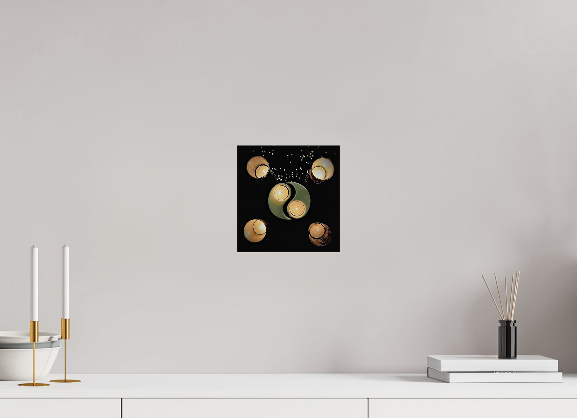 Cette oeuvre représente l'équilibre et la dualité à travers une composition lumineuse centrée sur un Yin et Yang accueillant deux bougies. Quatre autres bougies disposées autour renforcent la symétrie et diffusent une lueur apaisante. Les reflets sur le fond sombre créent un effet flottant, invitant à la méditation et symbolisant l'harmonie entre ombre et lumière.